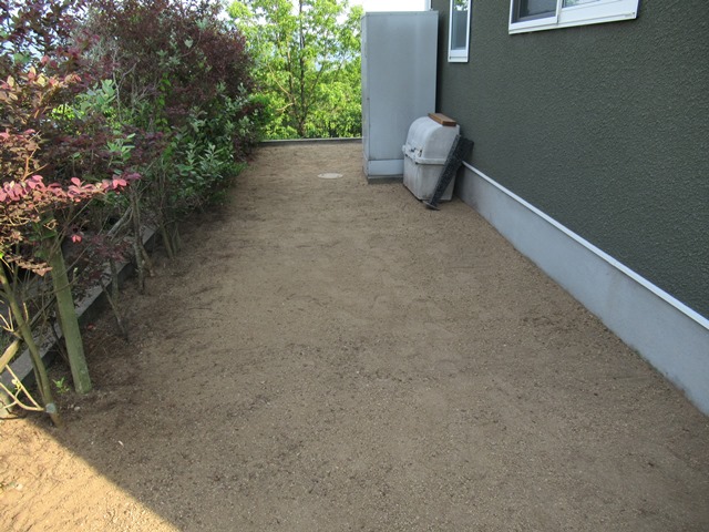 「庭の木と芝、草を何とかしたい!」以前、お世話になったお客様よりご相談をお受けいたしました。大木の剪定もあり、予算が限られているので、考えた結果、当社で配合したオリジナル防草土で施工することに至りました。