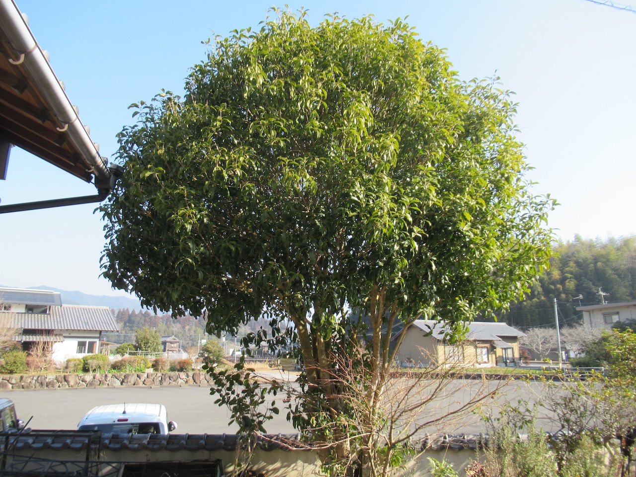 キンモクセイは屋根よりも大きく育っている様子。