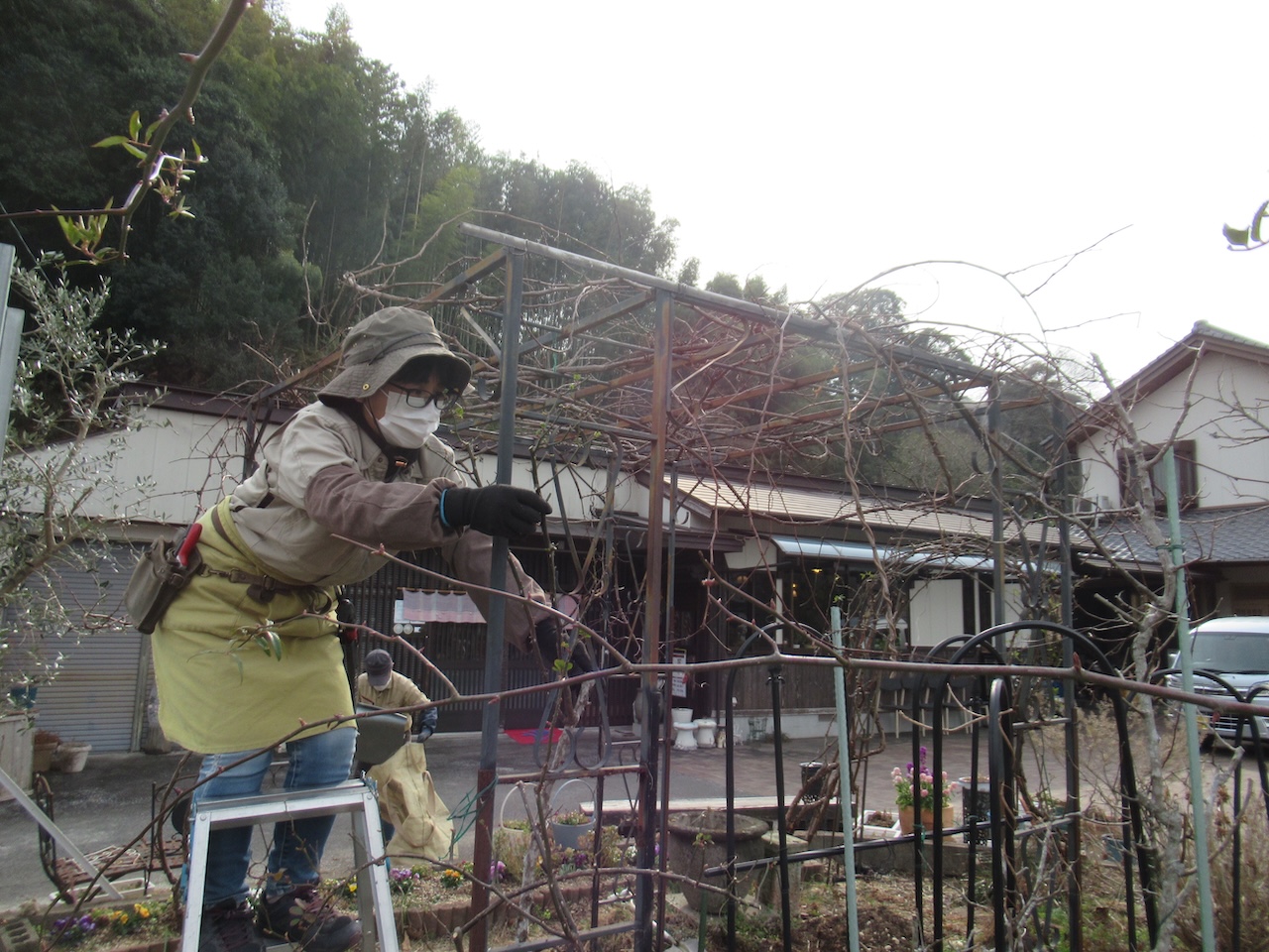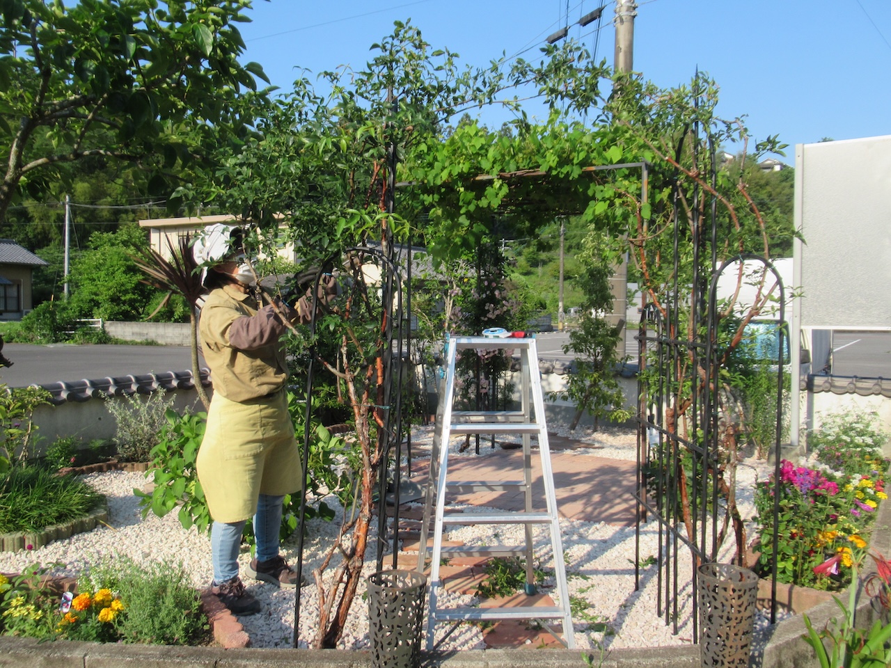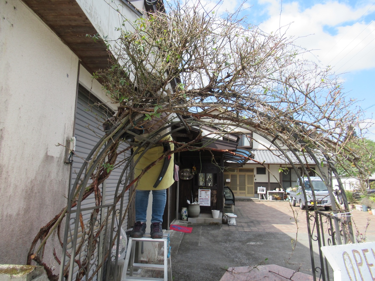 一度アーチから外し、剪定をいたします。