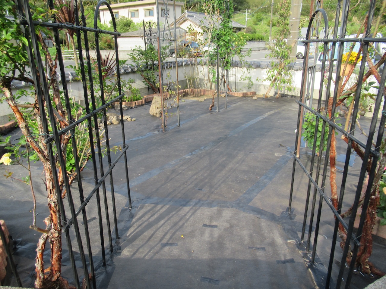 砂利やレンガなどを敷設して、モッコウバラの